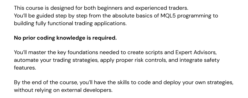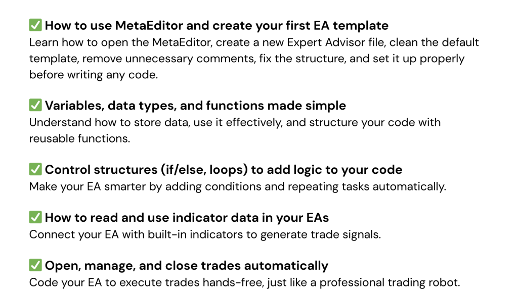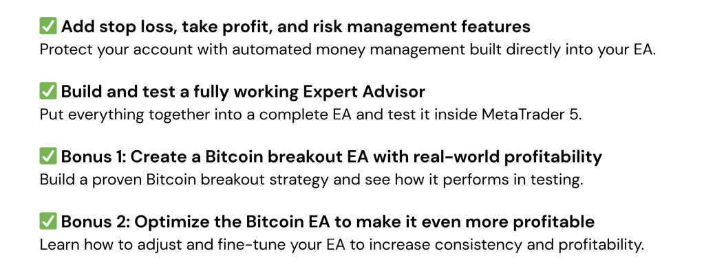 - 2 bonus lessons — includes a complete Bitcoin EA